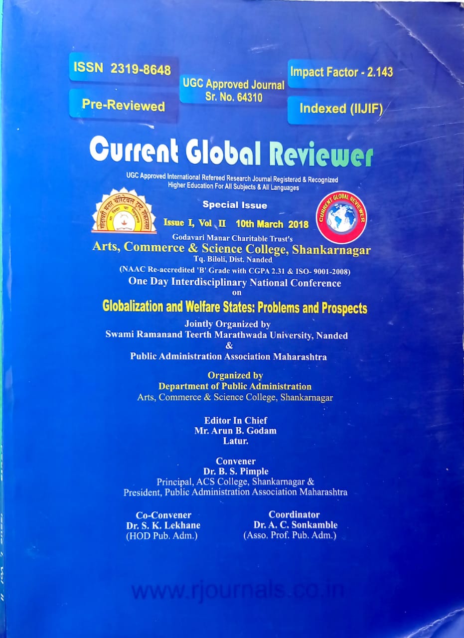 An art, Commerce & Science College has been established in 1991 under the umbrella of Godavari Manar Charitable Trust. Since then the College has been catering to the needs of rural and economically backward sections for the society. The main objective of the Trust is to provide higher education facility to these sections, more especially to the girl students. The enlarged vision of the President Hon. Bhaskarraoji Patil Khatgaonkar resulted in the establishment of this institution. Till then thousands of students have availed higher education facility. The students of this college have proved their skill and talent by means of participation in curricular and co-curricular activities. The college has been engaged in the arrangement of various activities. These include NAAC Cycle-I, Conference in Economics, Workshops in Public Administration, Botany, Chemistry & Commerce. In September 2016 the Institution has been reaccredited and acquired B grade. The present conference is a step towards the involvement of students in numbers of activities, so as to continue with the Quality Enhancement process.