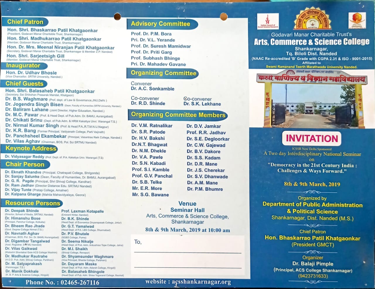 We are happy to invite you and faculty members of your esteemed institution for the Two Day National Seminar sponsored by ICSSR, New Delhi on “Democracy in the 21st Century India: Challenges and Ways Forward” being organized by Depart of Public Administration & Political Science Arts, Commerce & Science College, Shankarnagar, Dist. Nanded on 8th & 9th March 2019.