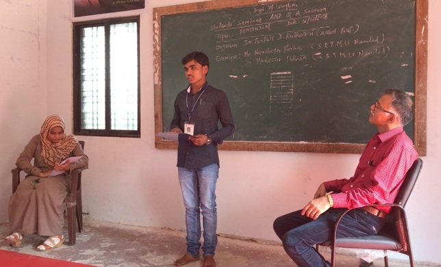 Final-Year students of Optional English Course of the two colleges, delivered anin-camera seminar on the literary topic of “Feminism” which was supervised byDr. Prafull D. Kulkarni of Sharadchandra College Naigaon Bz. and Dr. Jayant Cherekar of A.C.S.College Shankarnagar. The Seminar performance was judged by Mrs. Nausheen Farha and Mr. Mohsin - two external researchers of the Department of Languages, Literature and Culture of SRTM University, Nanded.